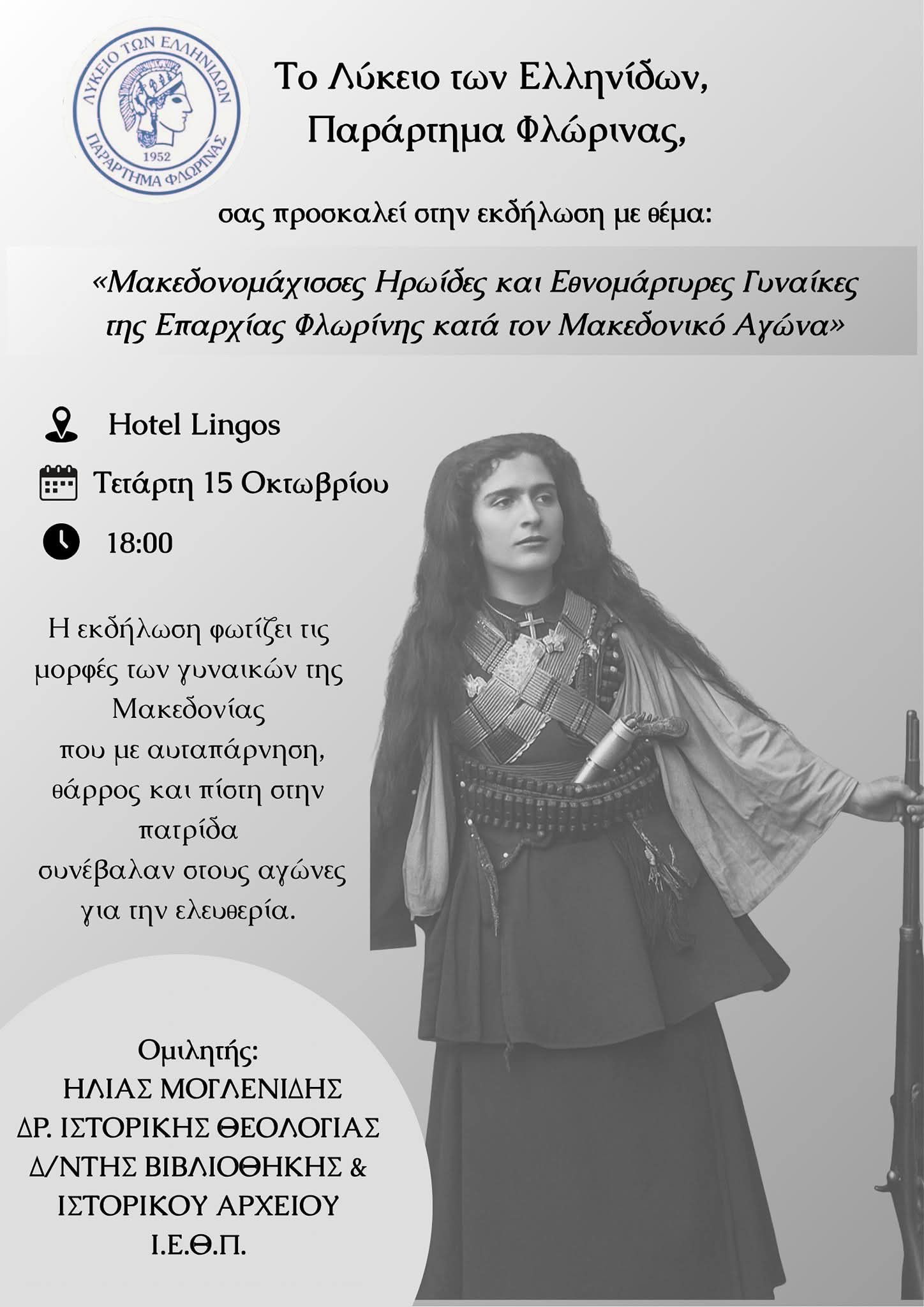 Το Λύκειο των Ελληνίδων Φλώρινας τιμά τις Μακεδονομάχισσες ηρωίδες και τις Εθνομάρτυρες γυναίκες της περιοχής μας.Σας προσκαλούμε σε μια ιδιαίτερη εκδήλωση με ομιλητή τον Δρ. Ηλία Μογλενίδη, Διευθυντή της Βιβλιοθήκης & του Ιστορικού Αρχείου της Ι.Ε.Θ.Π., με θέμα: «Μακεδονομάχισσες ηρωΐδες και Εθνομάρτυρες γυναίκες της Επαρχίας Φλωρίνης κατά τον Μακεδονικό Αγώνα»Τετάρτη